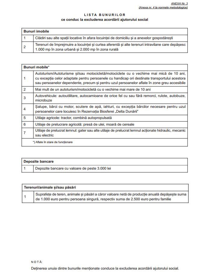 LISTA DE BUNURI CARE CONDUC LA EXCLUDEREA ACORDĂRII ALOCAȚIEI DE SUSȚINERE A FAMILIEI.